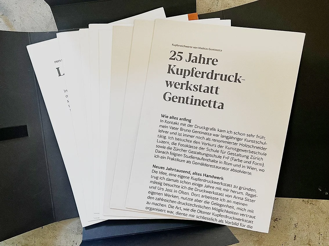 Begleitend zum Ausstellungsprojekt PRINT STORIES erschien eine Publikation in Form einer Mappe mit Einzelblättern. Die Publikation dokumentiert das druckgrafische Schaffen jener Künstlerinnen und Künstler, die 2025 in der Kupferdruckwerkstatt Gentinetta tätig waren. Insgesamt werden 18 druckgrafische Positionen vorgestellt, die zugleich auch die Vielfalt des Mediums Kupferdruck repräsentieren. Ein kunsthistorisches Vorwort erläutert die Besonderheiten sowie die Bedeutung des Kupferdrucks.